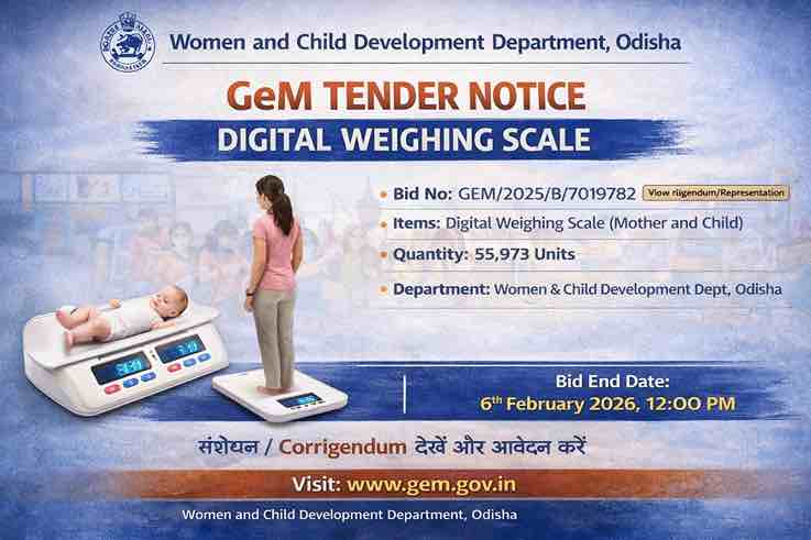 यह टेंडर Women and Child Development Department, Government of Odisha द्वारा जारी किया गया है। यह विभाग राज्य में महिला सशक्तिकरण, बाल विकास, पोषण और स्वास्थ्य संबंधी योजनाओं को लागू करता है। डिजिटल वेट मशीनों की खरीद से बच्चों और गर्भवती महिलाओं के स्वास्थ्य की निगरानी और भी प्रभावी होगी।