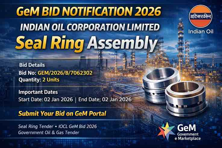 भारत सरकार के Government e-Marketplace (GeM) पोर्टल पर Ministry of Petroleum and Natural Gas के अंतर्गत Indian Oil Corporation Limited (IOCL) द्वारा एक नया GeM Bid Notification 2026 जारी किया गया है। यह बिड Seal Ring Assembly की आपूर्ति से संबंधित है, जो पेट्रोलियम और रिफाइनरी ऑपरेशंस में उपयोग होने वाला एक महत्वपूर्ण औद्योगिक कंपोनेंट है।Government Industrial Tender 2026