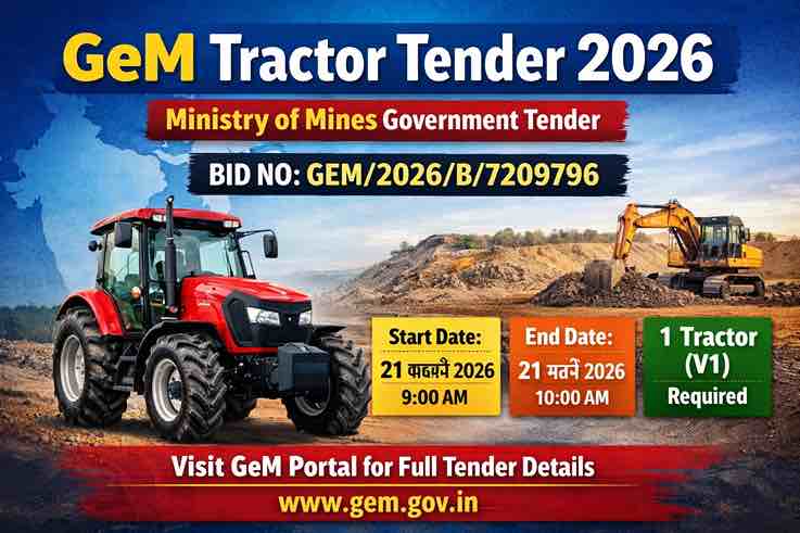 इस टेंडर का Bid Number GEM/2026/B/7209796 है और इसे Ministry of Mines के Materials Department द्वारा जारी किया गया है। GeM पोर्टल के माध्यम से सरकार विभिन्न उपकरण और सेवाओं की खरीद पारदर्शी तरीके से करती है, जिससे sellers को सीधे government buyers तक पहुंच मिलती है। Latest GeM Tractor Tender 2026