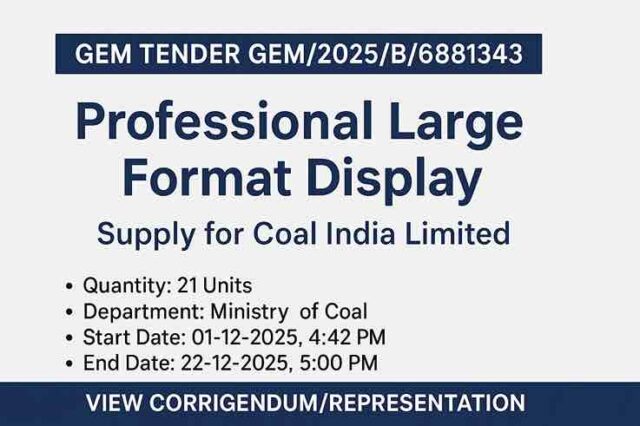 भारत सरकार के Ministry of Coal के तहत Coal India Limited (CIL) ने Government e-Marketplace (GeM) पर एक नया tender जारी किया है। इस BID NO: GEM/2025/B/6881343 के तहत Professional Large Format Display की खरीद की जाएगी। यह tender उन vendors के लिए एक अच्छा अवसर है जो advanced display solutions प्रदान करते हैं।