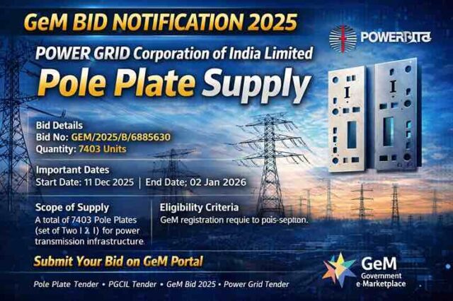 भारत सरकार के Government e-Marketplace (GeM) पोर्टल पर Ministry of Power के अंतर्गत POWER GRID Corporation of India Limited (PGCIL) द्वारा एक नया और महत्वपूर्ण GeM Bid Notification 2025 जारी किया गया है। यह बिड Pole Plate (Set of Two I & II) की आपूर्ति से संबंधित है, जो पावर ट्रांसमिशन इंफ्रास्ट्रक्चर के लिए एक आवश्यक सामग्री मानी जाती है। Ministry of Power Tender