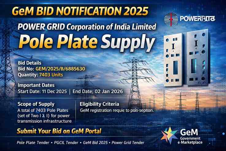 POWER GRID Corporation of India Limited देश की अग्रणी पावर ट्रांसमिशन कंपनियों में से एक है। इतनी बड़ी मात्रा में Pole Plate की आपूर्ति से संबंधित यह टेंडर पावर सेक्टर से जुड़े मैन्युफैक्चरर्स और सप्लायर्स के लिए एक महत्वपूर्ण व्यावसायिक अवसर प्रदान करता है।