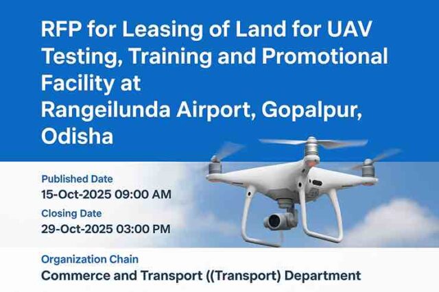 Odisha Government’s Commerce and Transport Department ने एक नया Request for Proposal (RFP) जारी किया है जिसमें Rangeilunda Airport, Gopalpur, Odisha में UAV (Unmanned Aerial Vehicle) testing, training और promotional facility स्थापित करने के लिए जमीन लीज़ पर देने की योजना है।