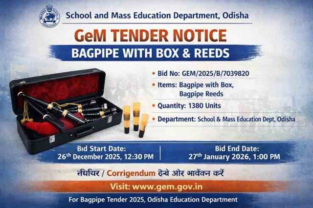 Government e-Marketplace (GeM) पर एक नया टेंडर जारी किया गया है, जिसमें Bagpipe with Box और Bagpipe Reeds की आपूर्ति की जानी है। यह टेंडर School and Mass Education Department, Odisha द्वारा जारी किया गया है। GeM पर पंजीकृत विक्रेता इस बिड में भाग ले सकते हैं। School Education Department Tender